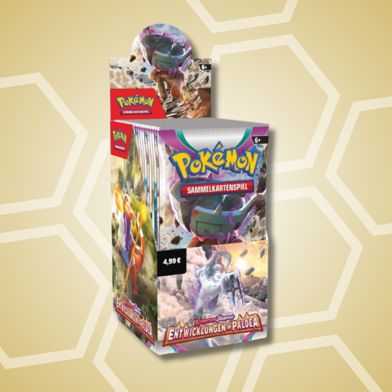 • 18 originale Booster Packs der Sammelkartenspielerweiterung “Karmesin & Purpur Entwicklungen von Paldea”