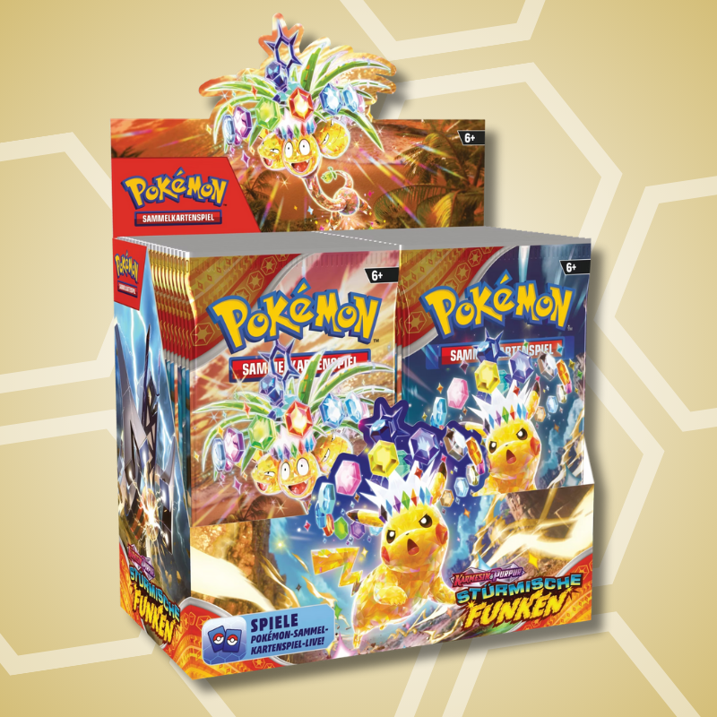 • 36 originale Booster Packs der Sammelkartenspielerweiterung “Karmesin & Purpur Stürmische Funken”